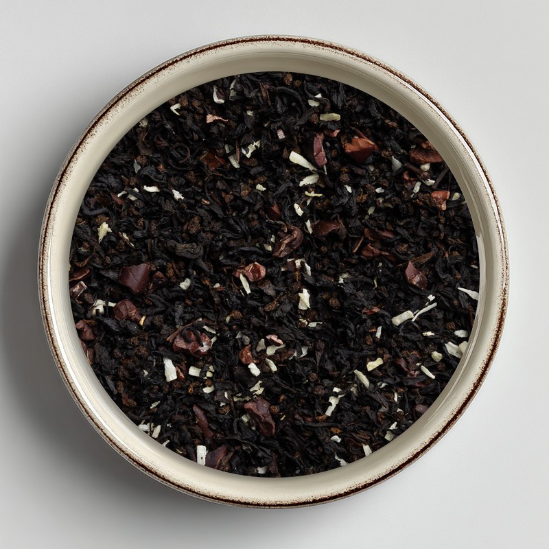 Ingrédients : thé noir Assam* (Inde du Sud), thé noir Assam CTC*, fève de cacao concassée*, coco*, extrait de cacao*.