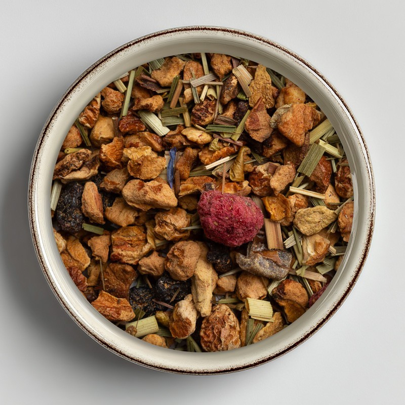 Ingrédients : pomme*, coing*, citronnelle*, raisin (huile végétale)*, datte (farine de riz)*, arôme naturel (pamplemousse, citron, bergamote, framboise), fleurs de bleuet*, framboise*, écorces de citron*, acérola*.