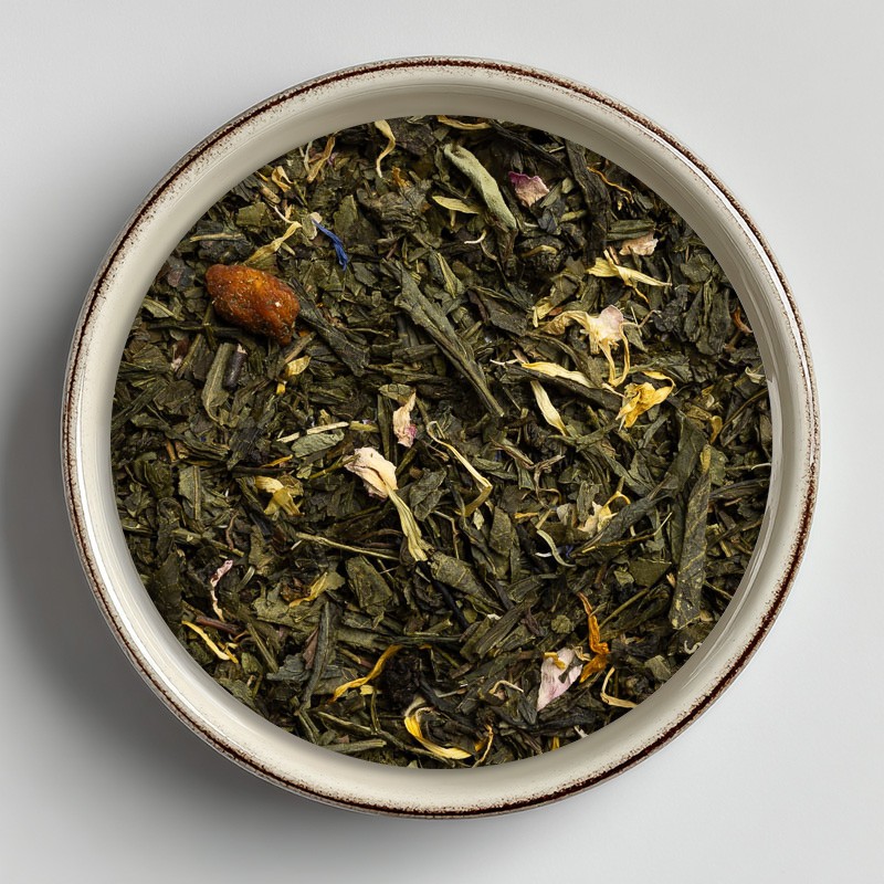 Ingrédients : thé vert China Sencha*, China Oolong*, arôme naturel (pêche, orange, mangue), morceaux de mangue*, pétales de rose*, fleurs de souci*, papaye*, passiflore*, fleurs de bleuet*.